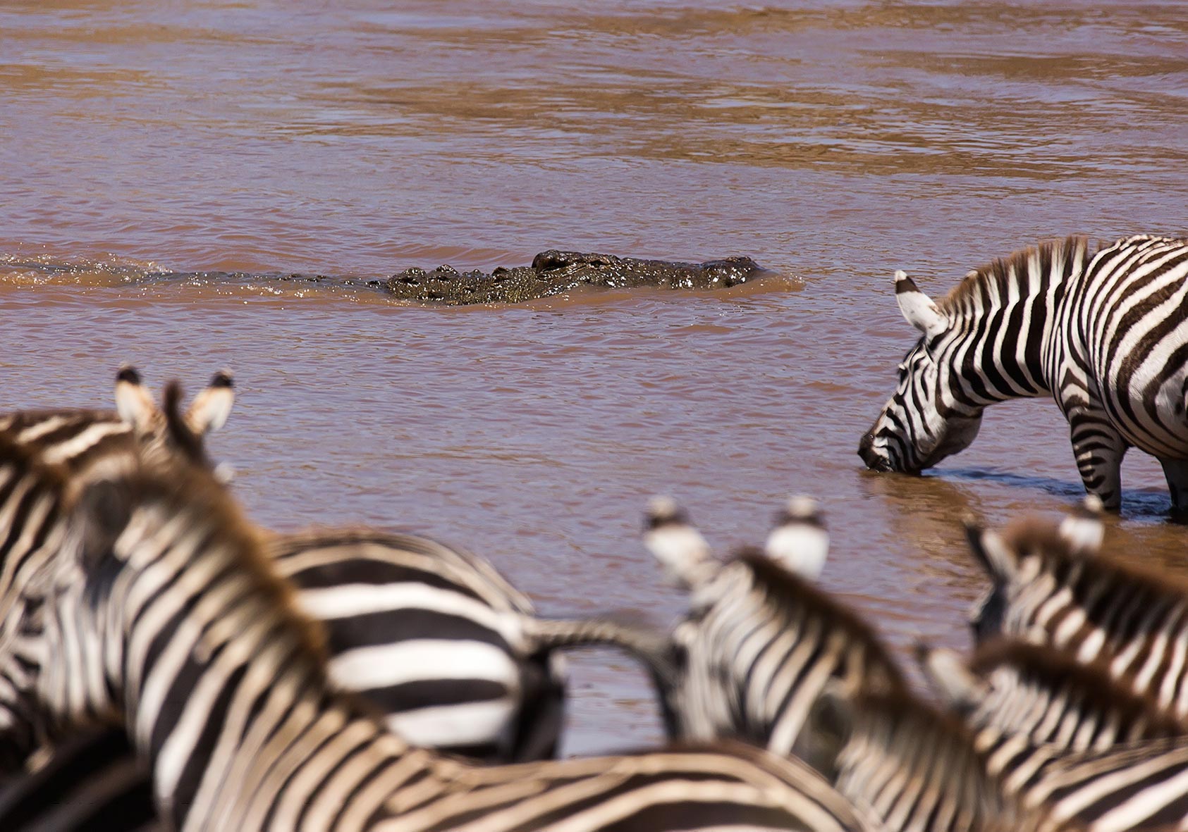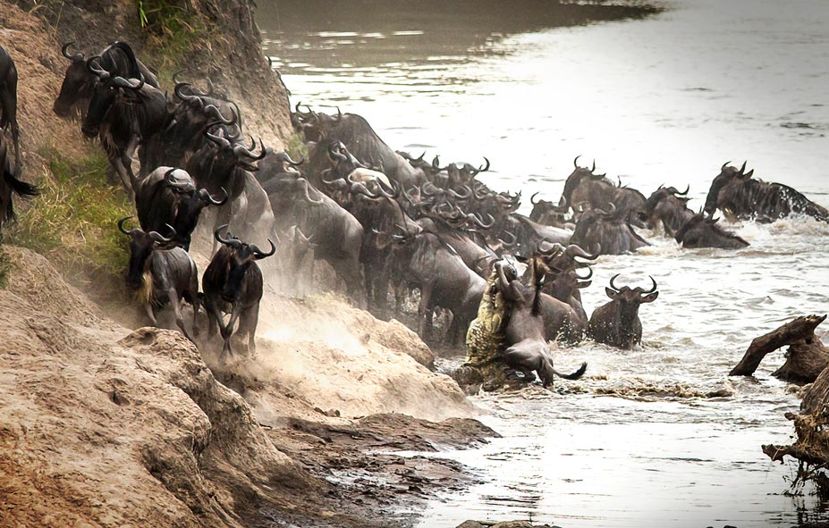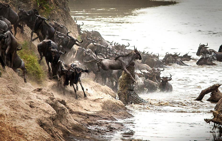 The river crossing is the biggest challenge for the migrating herds. The Mara River is rigged with lurking threats just beneath the surface; massive crocodiles are poised for an ambush. These formidable predators have been waiting all year for this moment, as the migration signals the start of their hunting and feeding season.