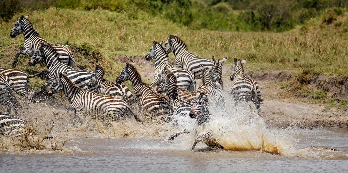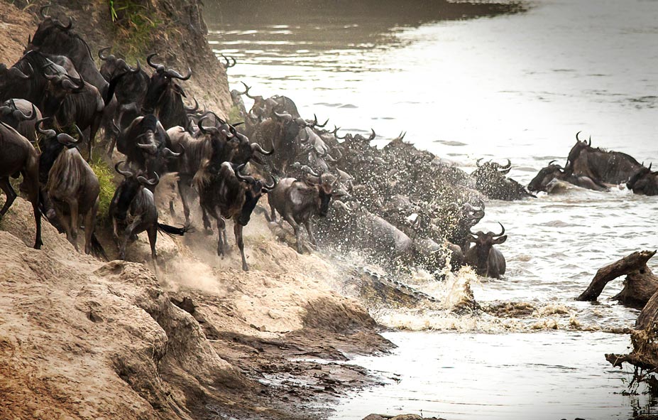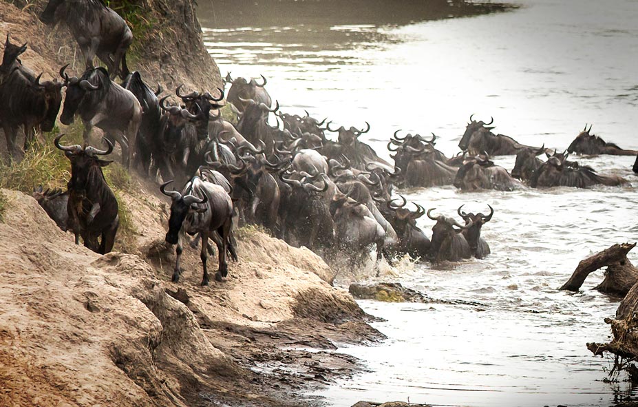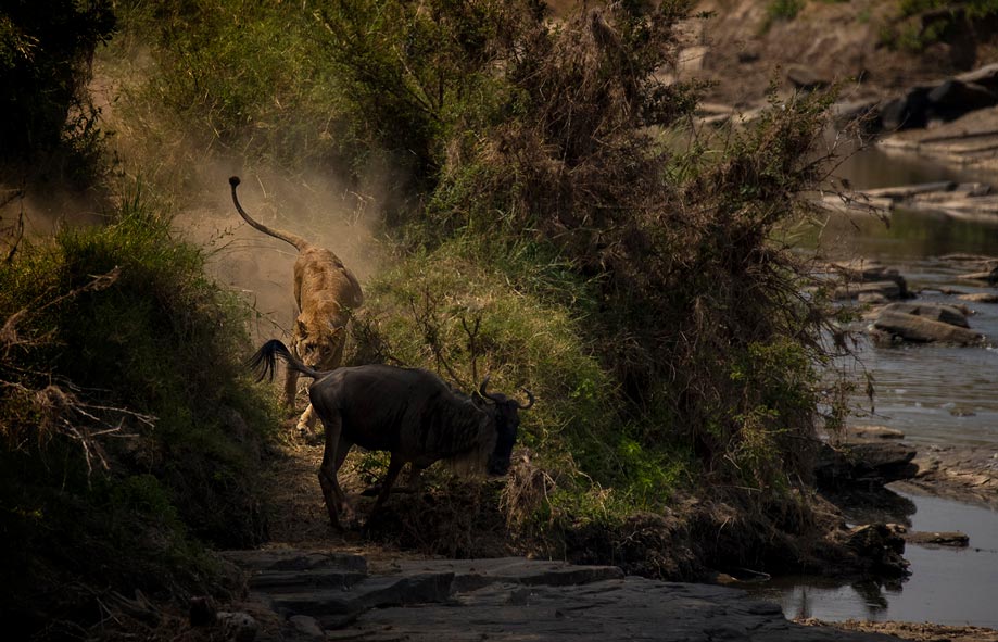 As the herds of wildebeest and zebras approach the river crossing, the atmosphere becomes tense with danger. Predators, particularly lions, are strategically positioned both in the open fields and along the riverbanks, ready to ambush the unsuspecting and now very stressed herds. The sounds of the migrating herds and their heightened anxiety create a dramatic backdrop for this crucial moment in their migration, turning the river crossing into a high-stakes spectacle. This setting offers exceptional photography opportunities to capture the urgency and drama of nature as the herds navigate both the treacherous waters and the lurking threats.