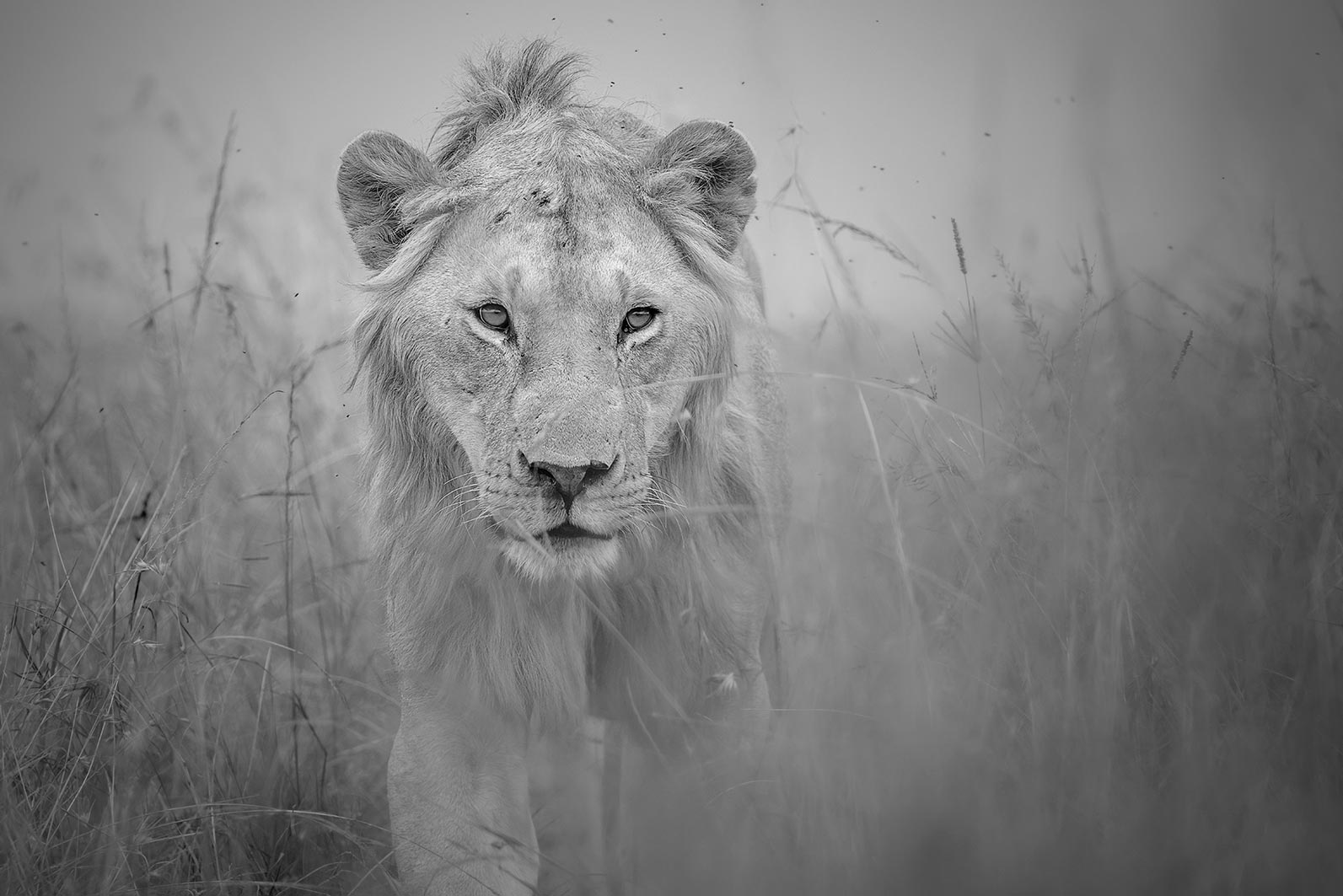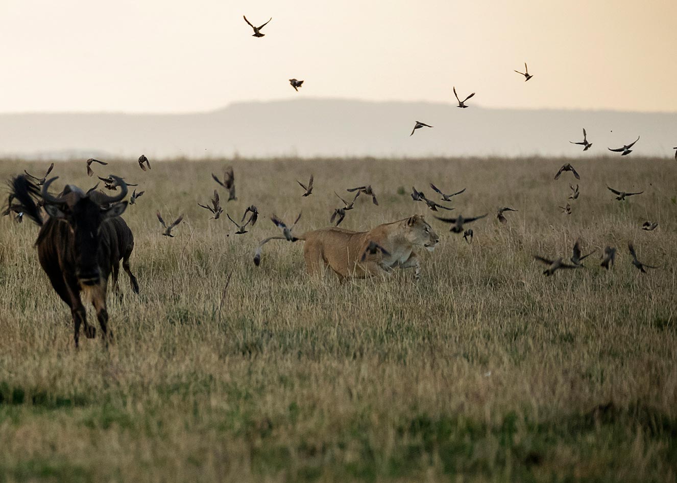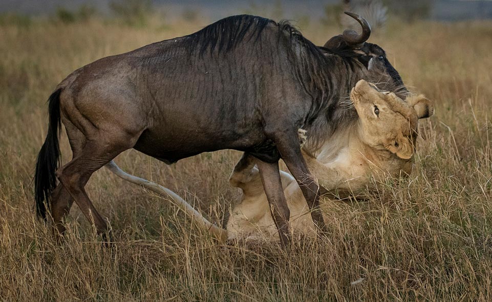 As the vast herds of wildebeest and zebras graze through the tall grass of the Maasai Mara, grass and vegetation provides both nourishment and concealment. Hidden within this thick cover, a lioness lies in wait, her keen eyes scanning the moving masses for the perfect opportunity to strike. Her objective is clear:Â make a successful ambush that will provide sustenance for her and her pride. The long grass not only hides her stealthy approach but also serves as natural camouflage, allowing her to blend seamlessly into the landscape.